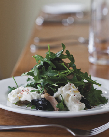 - Remove the mushrooms draining them. Place in a mixing bowl with the arugula. Add vinegar, half of the olive oil, salt and pepper. Toss lightly and transfer to four plates. Tear the burrata into pieces and divide among the salads, drizzling with oil.