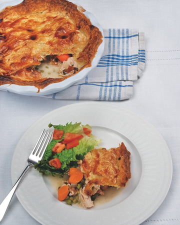 - Pour into oven safe pie dish. Top chicken mixture with thawed puff pastry dough and trim edges to fit dish. Brush with lightly beaten egg and pierce dough with a knife in a few spots to allow steam to escape. Bake for 20 to 30 minutes, or until crust is golden brown.