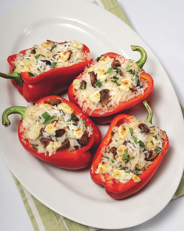 - Take prepared red peppers and stuff with the mixture, arrange in oiled baking dish, and bake for 25-30 minutes. During the last 10 minutes, top them with crumbled Boursin cheese and cook until golden brown.